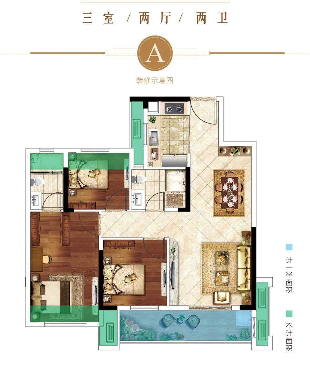 ? ? ? ?新推出的95㎡做成了3房2廳2衛(wèi)還帶一個(gè)陽臺(tái),陽臺(tái)、臥室、衛(wèi)浴均有贈(zèng)送面積,因此獲得高得房率,這個(gè)戶型設(shè)計(jì)一直是鼎觀的明星戶型。