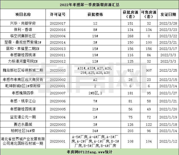 ? ? ? ?二、2022年第一季度孝感新增房源2876套