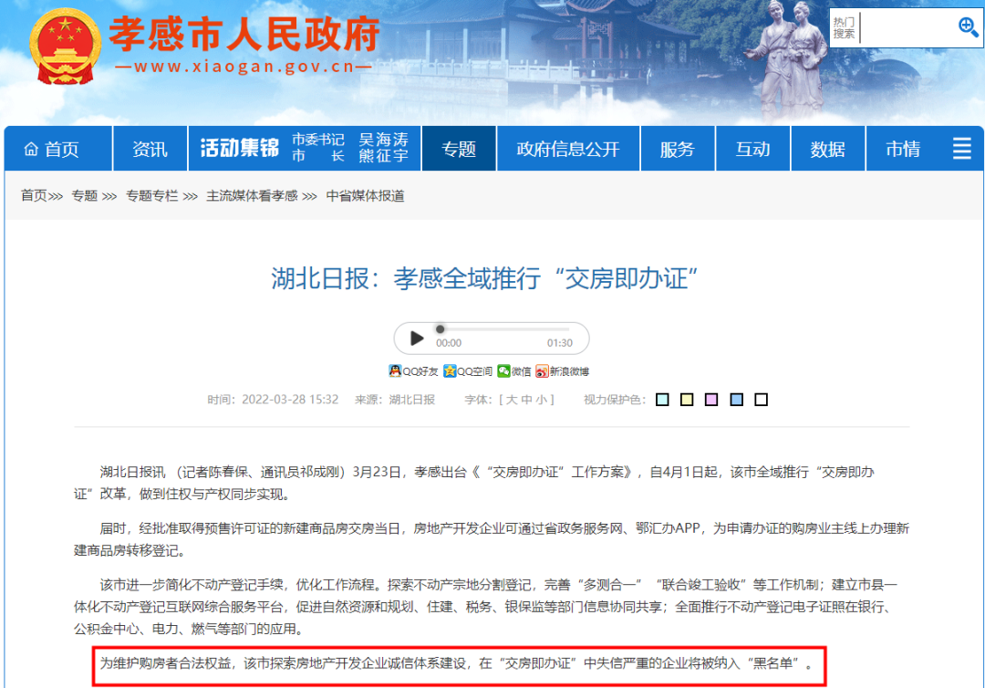 ? ? ? ?自4月1日起,孝感市全域推行“交房即辦證”改革,做到住權(quán)與產(chǎn)權(quán)同步實(shí)現(xiàn)。