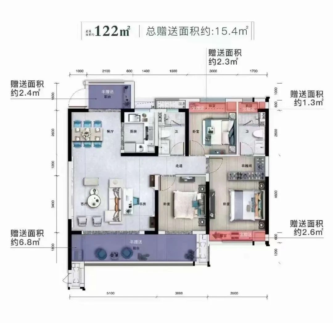 ? ? ? ?3-1403,建面約121.76㎡,惠后總價840536元、惠后單價6903元/㎡。戶型方正,三房兩廳兩衛(wèi),帶大陽臺,更吸引人的是高贈送面積達約15.4㎡。還比報出來的均價低了快一千元。(去看房之前提前咨詢房源是否還在)