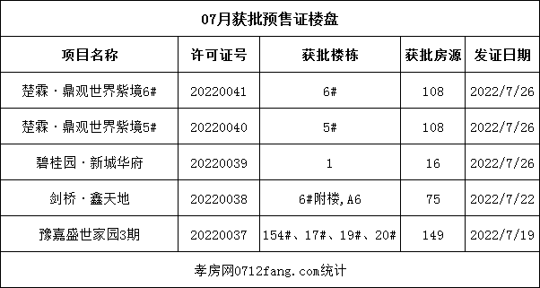 ? ? ? ?7月份有4個(gè)項(xiàng)目456套房源拿到預(yù)售許可證號(hào)。