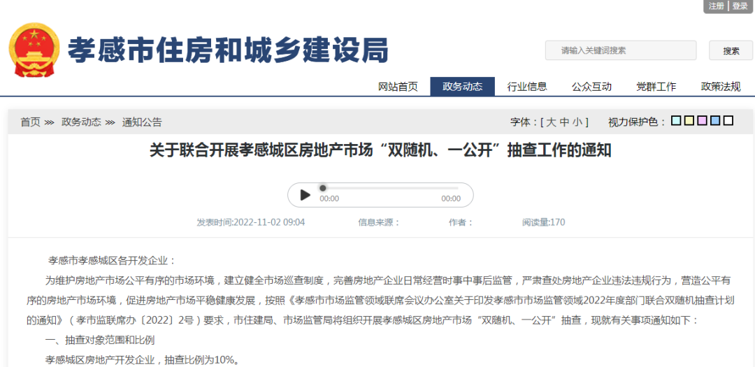 ? ? ? ?為維護房地產(chǎn)市場公平有序的市場環(huán)境,建立健全市場巡查制度,完善房地產(chǎn)企業(yè)日常經(jīng)營時事中事后監(jiān)管,嚴肅查處房地產(chǎn)企業(yè)違法違規(guī)行為,營造公平有序的房地產(chǎn)市場環(huán)境,促進房地產(chǎn)市場平穩(wěn)健康發(fā)展,按照《孝感市市場監(jiān)管領(lǐng)域聯(lián)席會議辦公室關(guān)于印發(fā)孝感市市場監(jiān)管領(lǐng)域2022年度部門聯(lián)合雙隨機抽查計劃的通知》(孝市監(jiān)聯(lián)席辦〔2022〕2號)要求,市住建局、市場監(jiān)管局將組織開展孝感城區(qū)房地產(chǎn)市場“雙隨機、一公開”抽查,現(xiàn)就有關(guān)事項通知如下:
