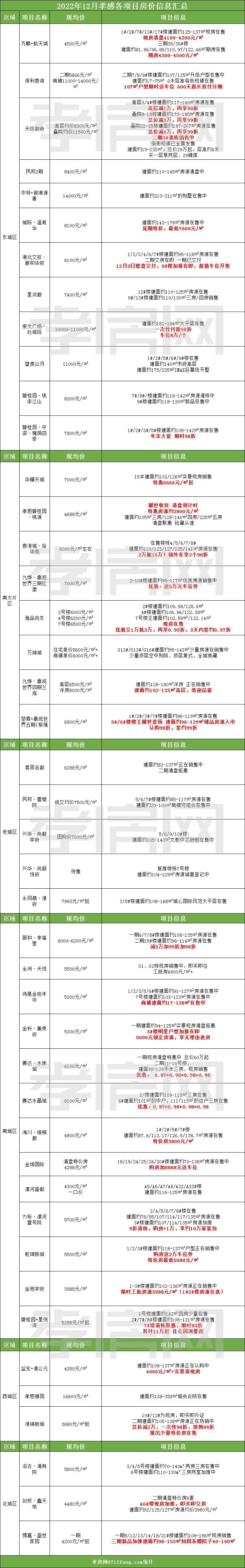 ? ? ? ?不完全統(tǒng)計(jì)了孝感44個在售樓盤的房價(jià)、在售樓棟面積、優(yōu)惠,12月大部分樓盤基本無變化,但依然會在節(jié)點(diǎn)的時(shí)候推出一些特價(jià)房,幾個少數(shù)樓盤直接下調(diào)了價(jià)格。增加了一個新盤興華尚都悅府,首推7號樓。