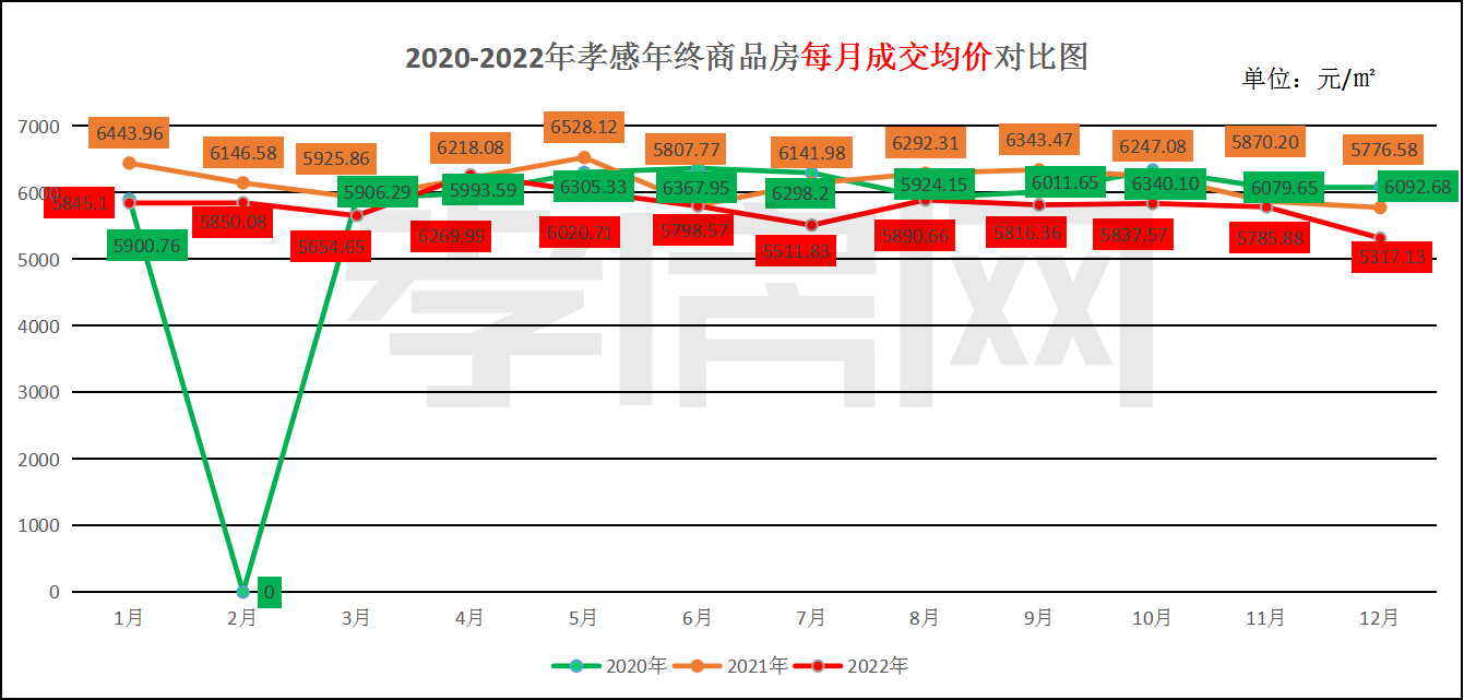 2020-2022年孝感年終商品房每月成交均價對比圖