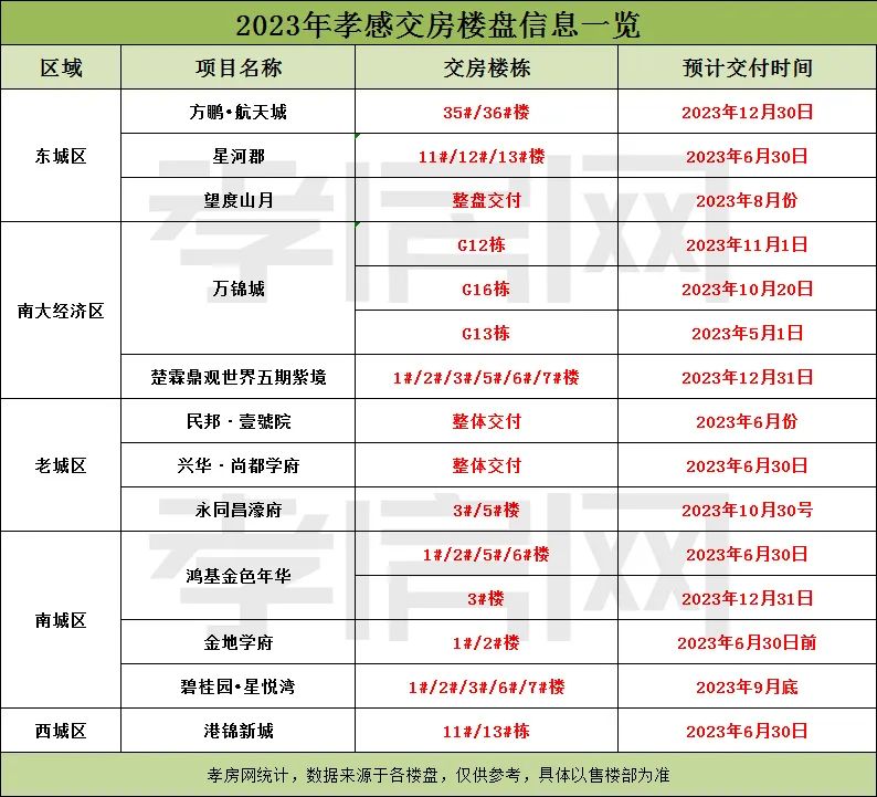 ? ? ? ? 據(jù)不完全統(tǒng)計(jì),孝感12樓盤(pán)將在2023年有交房計(jì)劃,交房日期主要集中在年中和年尾。