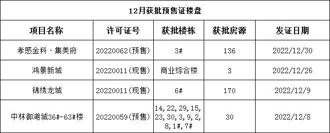 ? ? ? ?根據(jù)孝感市住房和城鄉(xiāng)建設(shè)局公布的信息,12月份孝感4個(gè)樓盤共339套房源拿到商品房預(yù)售許可證。其中錦繡龍城補(bǔ)證,鴻景新城商業(yè),中林御湖源著是別墅,只有金科集美府是高層商品住房。