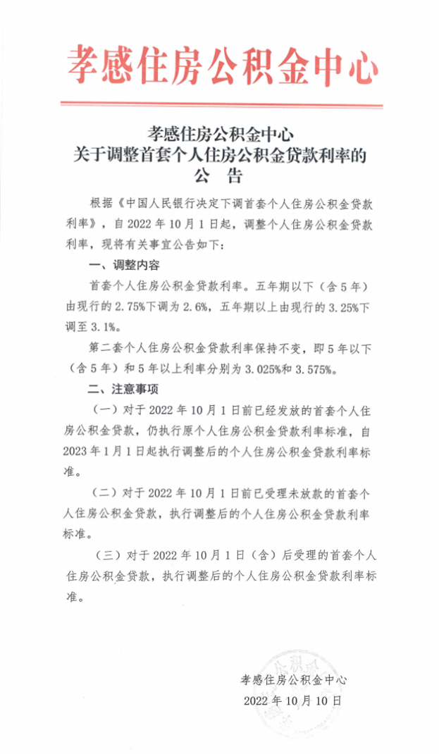 06.10月1日,孝感確認(rèn)下調(diào)首套個(gè)人住房公積金貸款利率