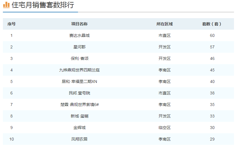 ? ? ? ?截止目前孝感商品住宅銷售套數(shù)917套,銷售面積106000㎡。銷售TOP10榜單里南城區(qū)2個盤、東城區(qū)3個、南大2個、老城區(qū)1個、臨空區(qū)1個、楊店鎮(zhèn)1個。