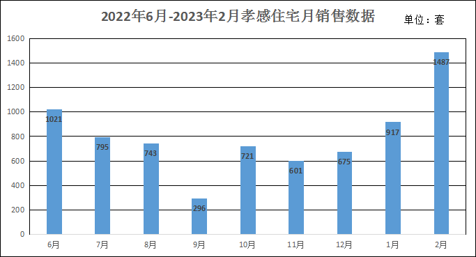 ? ? ? ?2月份銷量猛增,孝感住宅銷售1487套,是2022年以來的峰值。同近半年其它月份銷售套數(shù)相比,可以說是翻倍上漲。