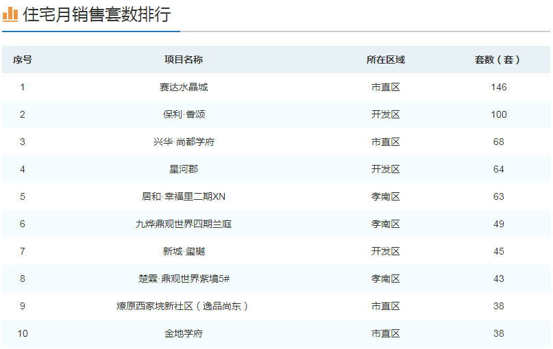 ? ? ? ?榜首的賽達水晶城月銷售達到146套,保利香頌以100套位居第二,興華尚都學(xué)府以68套居第三。