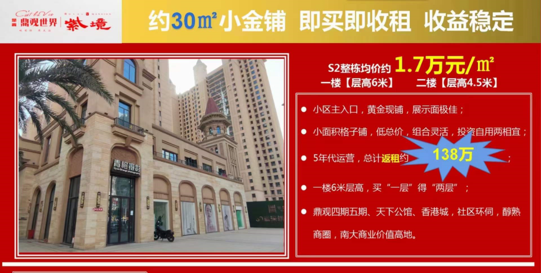 ? ? ? ?除此之外,還有建面約30㎡的底商在售, S2整棟均價(jià)約1.7萬(wàn)元/㎡,一樓層高6米,二樓層高4.5米,五年代運(yùn)營(yíng),返租約138萬(wàn)。