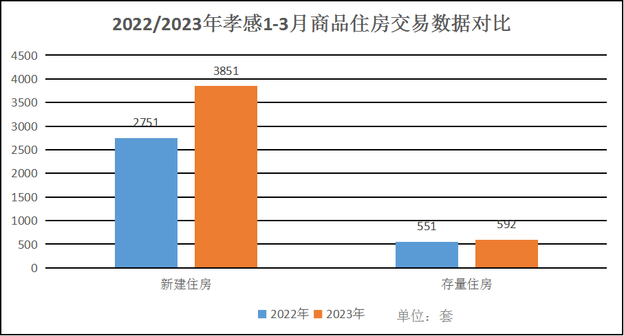 ? ? ? ?從交易看,2023年1-3月,孝感城區(qū)新建商品住房銷售3851套,銷售面積44.83萬平方米,同比增長39.96%,環(huán)比下降13.39%。