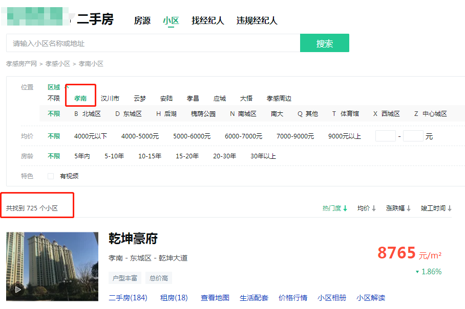 ? ? ? ?在孝感某二手房網(wǎng)站上,孝南有掛牌的二手房小區(qū)有725個,其中灣流匯掛牌房源有368套,中建國際尚都掛牌房源有211套,乾坤豪府有184套等。還有剩余的722個小區(qū),這些掛牌房源加起來數(shù)據(jù)就很可觀了!