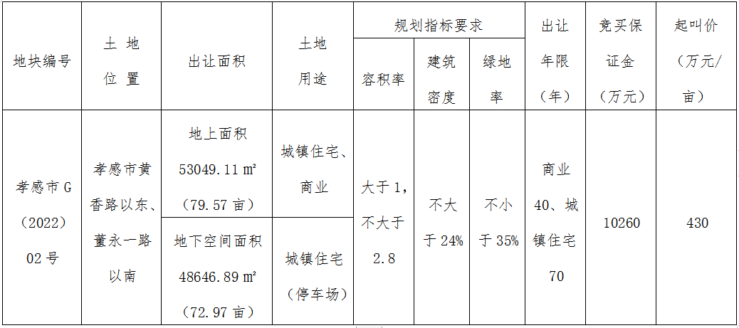 ? ? ? ?孝感市G(2022)02號(hào)地塊位于孝感市黃香路以東、董永一路以南。地上面積53049.11㎡(79.57畝)、地下空間面積48646.89㎡(72.97畝),規(guī)劃用途為城鎮(zhèn)住宅、商業(yè),容積率大于1不大于2.8,建筑密度不大于24%,綠地率不小于35%。