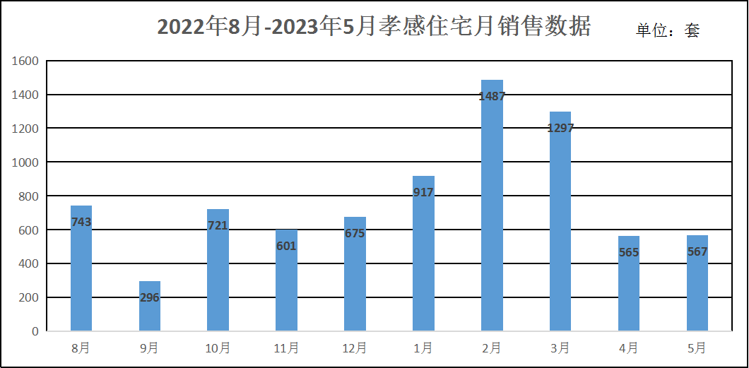 ? ? ? ?2023年5月,孝感商品房住宅銷售567套,住宅面積銷售6.73萬(wàn)㎡。套數(shù)環(huán)比4月(565套)基本持平。