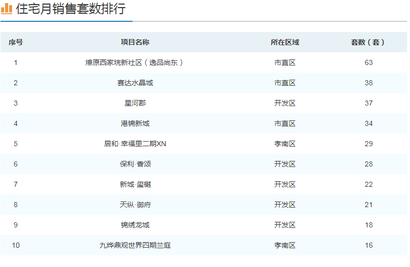 ? ? ? ?5月銷售TOP前三分別為:逸品尚東(63套)、賽達(dá)水晶城(38套)、星河郡(37套)。上月銷售套數(shù)排行榜的前10里面,逸品尚東和錦繡龍城是補(bǔ)證。