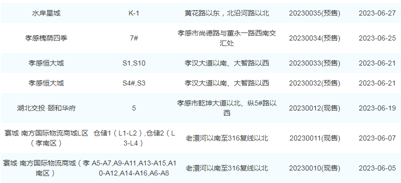 ? ? ? ?6月份孝感共5個樓盤獲得7張預(yù)售許可證,其中寰城南方國際、孝感恒大城(已改為東城河畔)獲批的是商業(yè)部分,