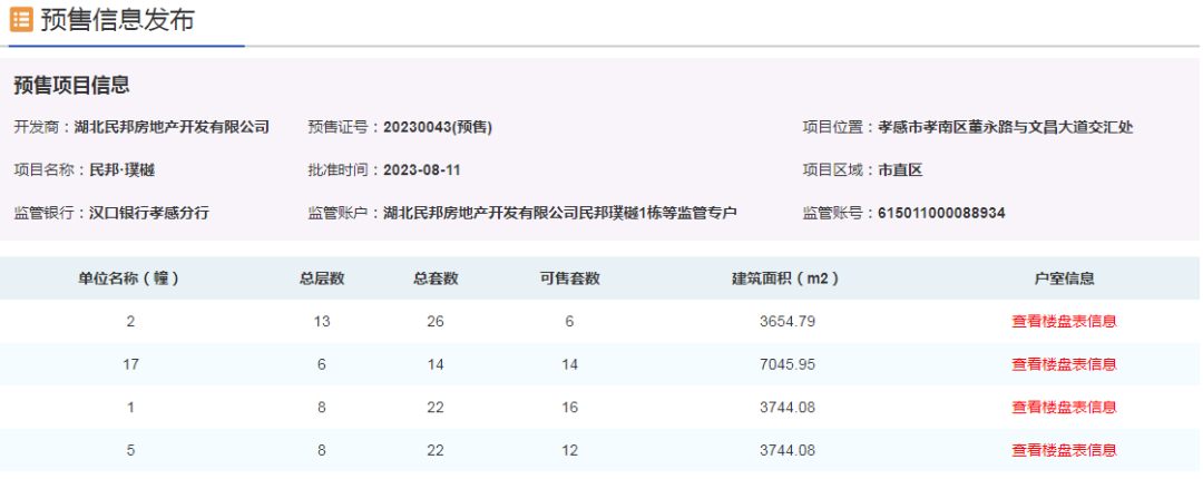 ? ? ? ?2022年7月29日湖北民邦以500萬元/畝拿下孝感市G(2022)01號地塊。2023年5月1日項目啟動驗資,經(jīng)過3個多月的蓄客期,于8月12日開盤。首開1/2/3/5/6#樓。