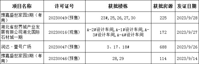 ? ? ? ?9月份孝感共有3個盤拿到4張商品房預(yù)售許可證,共1199套房源。其中豫豫嘉盛世家園是6-11層的多層洋房,共339套房源;石材城是廠區(qū);潤達(dá)壹號廣場688套是補(bǔ)證。相比于9月來說,供貨量有所放緩。