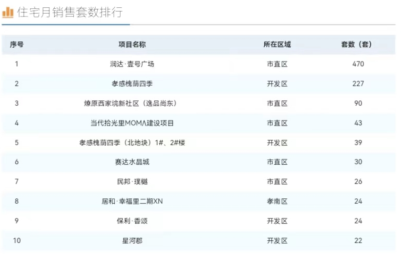 ? ? ? ?1、本篇數(shù)據(jù)為不完全統(tǒng)計,新盤數(shù)據(jù)僅包含孝感主城區(qū)在售樓盤;