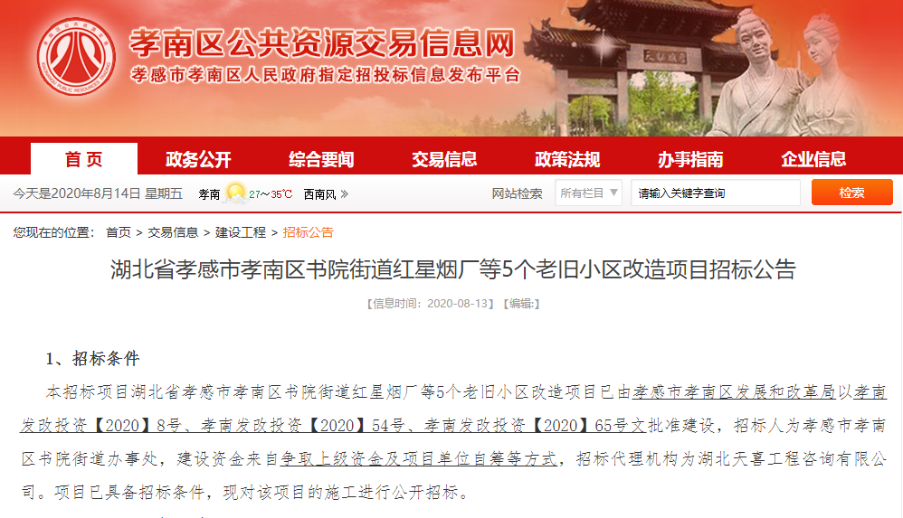 昨日,孝南區(qū)公共資源交易信息網(wǎng)發(fā)布招標公告,湖北省孝感市孝南區(qū)書院街道紅星煙廠等5個老舊小區(qū)改造正在招標中。