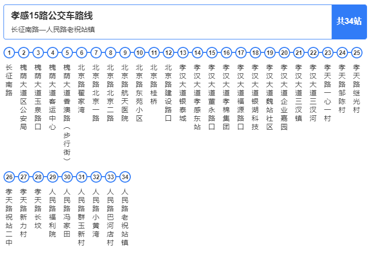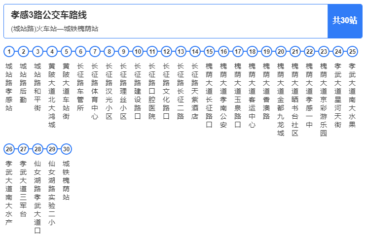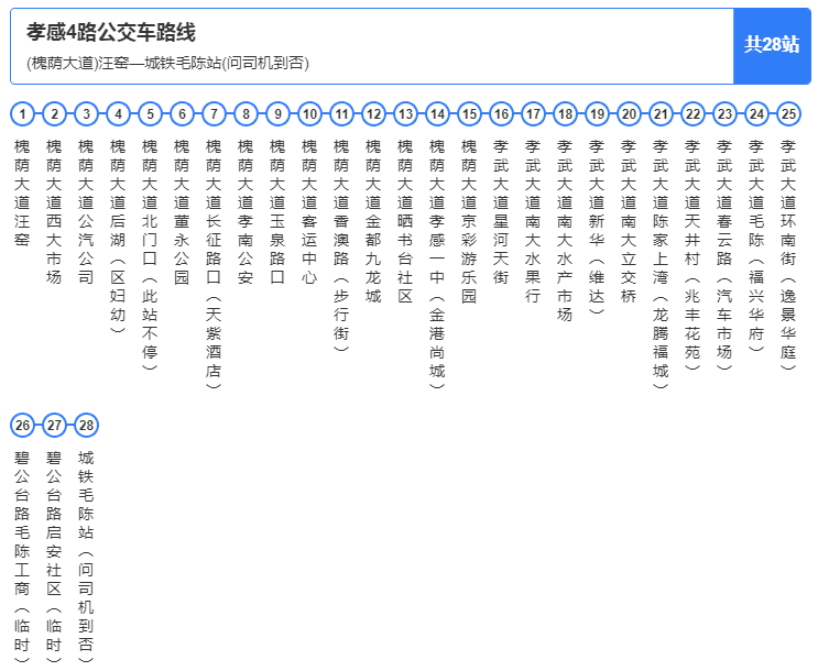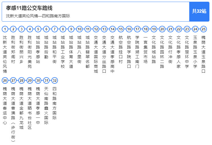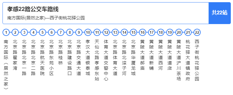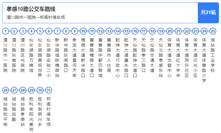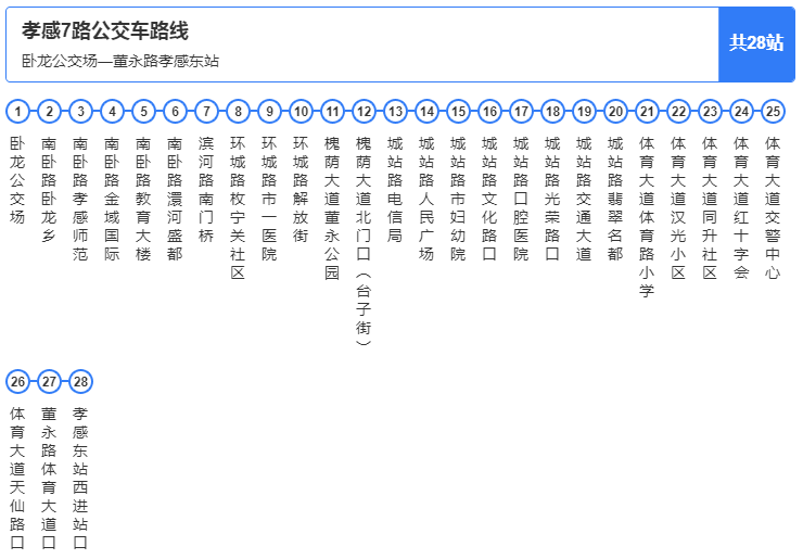 上行:臥龍鄉(xiāng)政府→孝感師范學(xué)校→金域國際→教育大樓→澴河盛都→濱河路口→長征南路→中醫(yī)院→董永公園→北門口臺子街→北門口→人民廣場→市婦幼保健院→城站路文化路口→宇濟(jì)商貿(mào)城→城站路光榮路口→城站路交通路口→城站路翡翠名都→體育路小學(xué)→漢光小區(qū)→同升社區(qū)→紅十字會→交警指揮中心→體育路天仙路口→體育路董永路口→孝感東站。