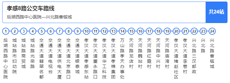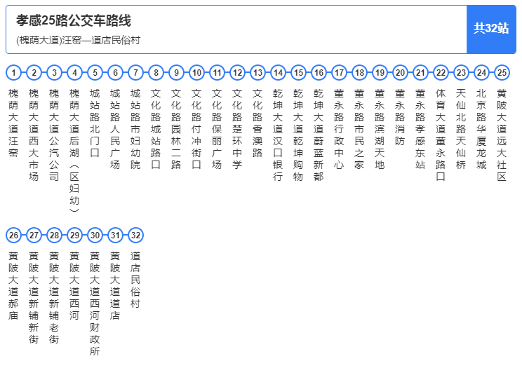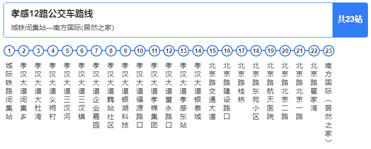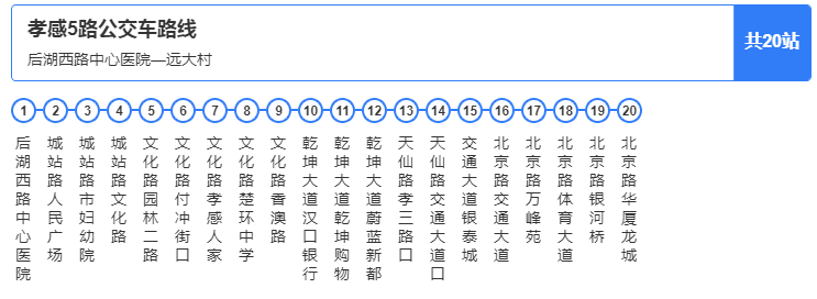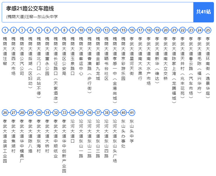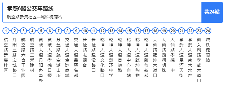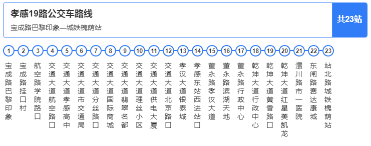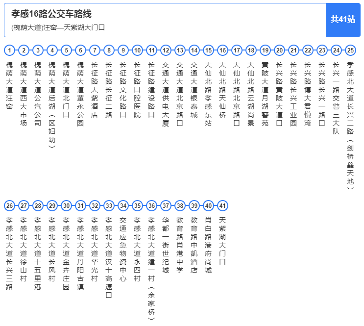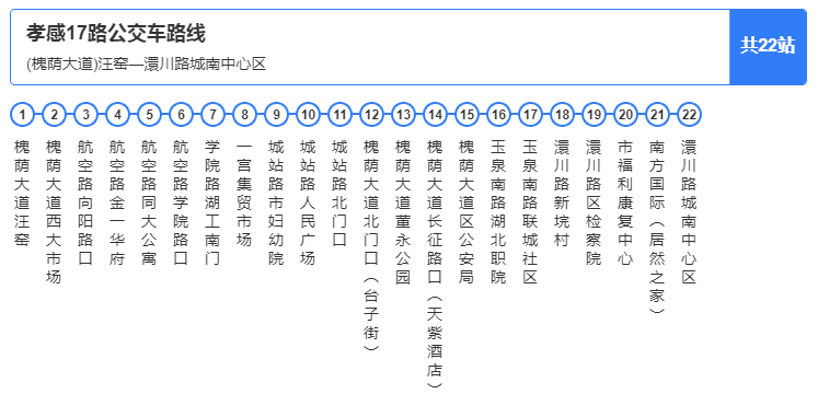 線路大致走向:汪窯—西大寶成路—后湖小學(xué)—寶成路學(xué)院路口—同大公寓—航空路學(xué)院路口—掛口村—交通路航空路口—孝高—交通路分絲路口—理絲小區(qū)(翡翠名都)—供電大廈(北京路口)—銀泰城—孝漢大道董永路 (東站入口)—東站下車點(diǎn)—東站上車點(diǎn)—東站廣場—董永路孝漢大道口(消防)—濱湖天地—市民之家—行政中心—福興大道黃香路口—紅星美凱龍—市公安局—市新一醫(yī)院。
