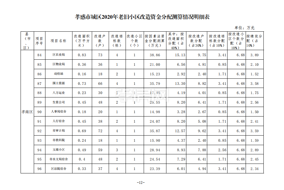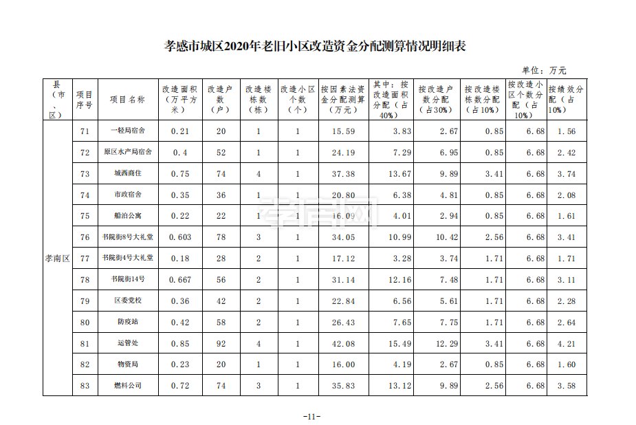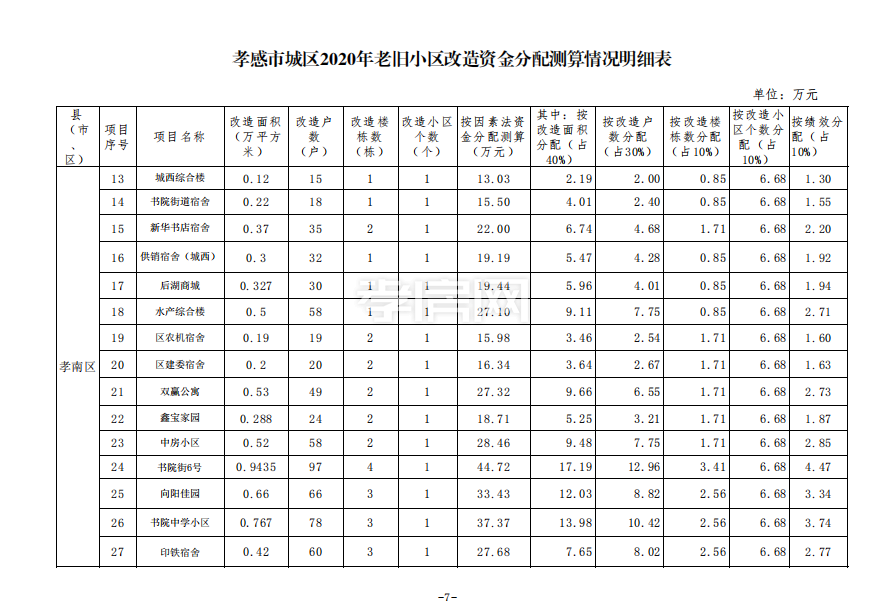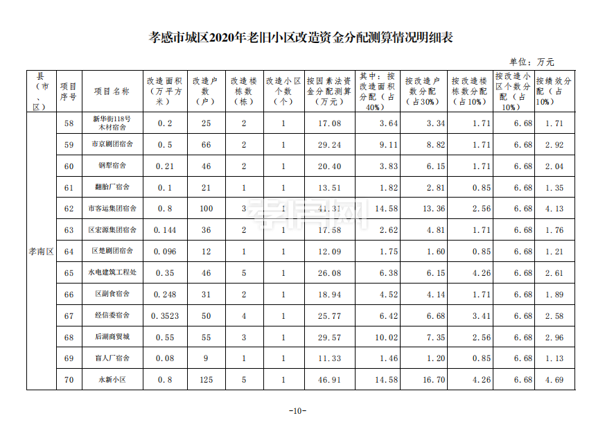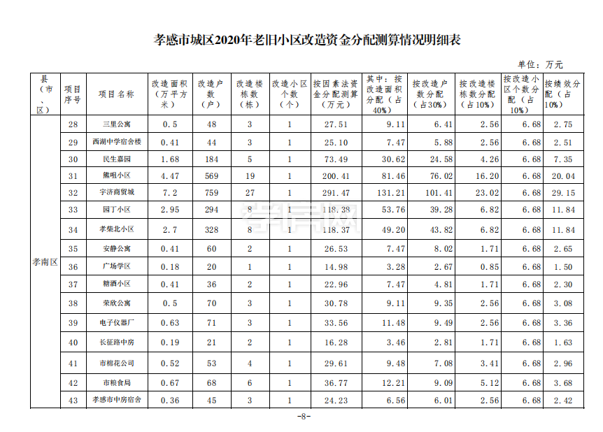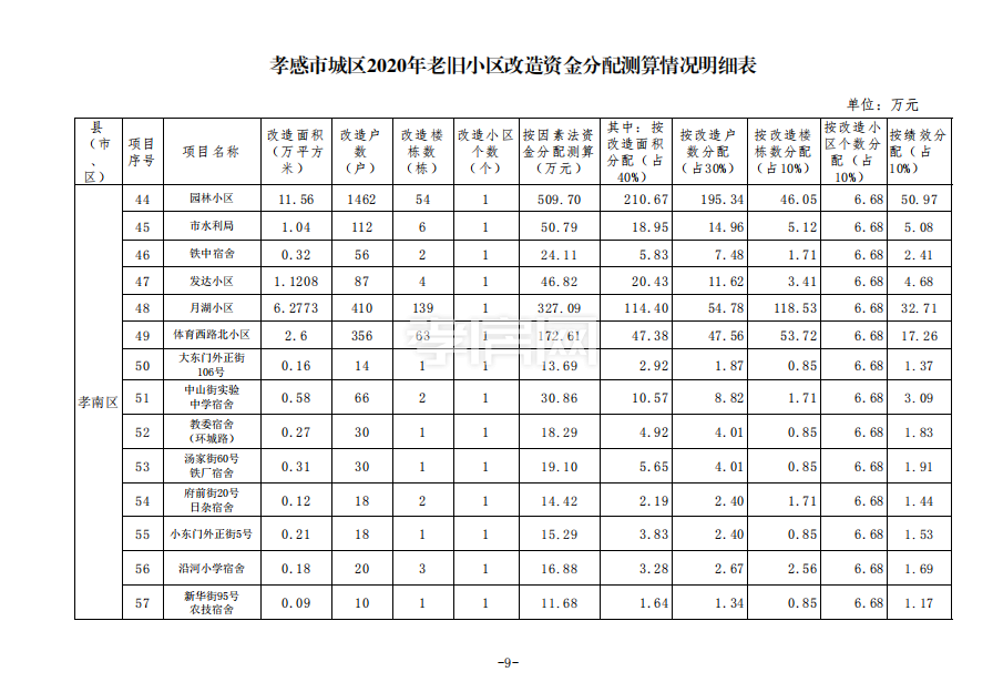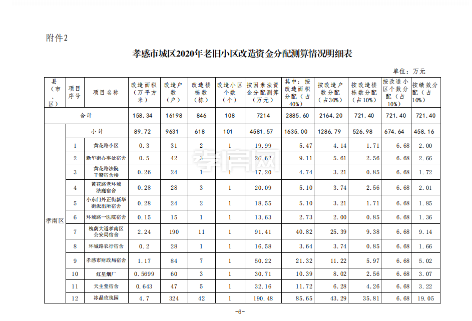 其中:涉及孝南區(qū)101個(gè)老舊小區(qū),涉及樓棟618棟,涉及戶數(shù)9631戶,涉及建筑面積89.718 萬平方米;涉及高新區(qū)7 個(gè)老舊小區(qū),涉及樓棟228棟,涉及戶數(shù)6567戶,涉及建筑面積68.625 萬平方米。詳見孝感市城區(qū)2020年老舊小區(qū)改造資金分配情況表。