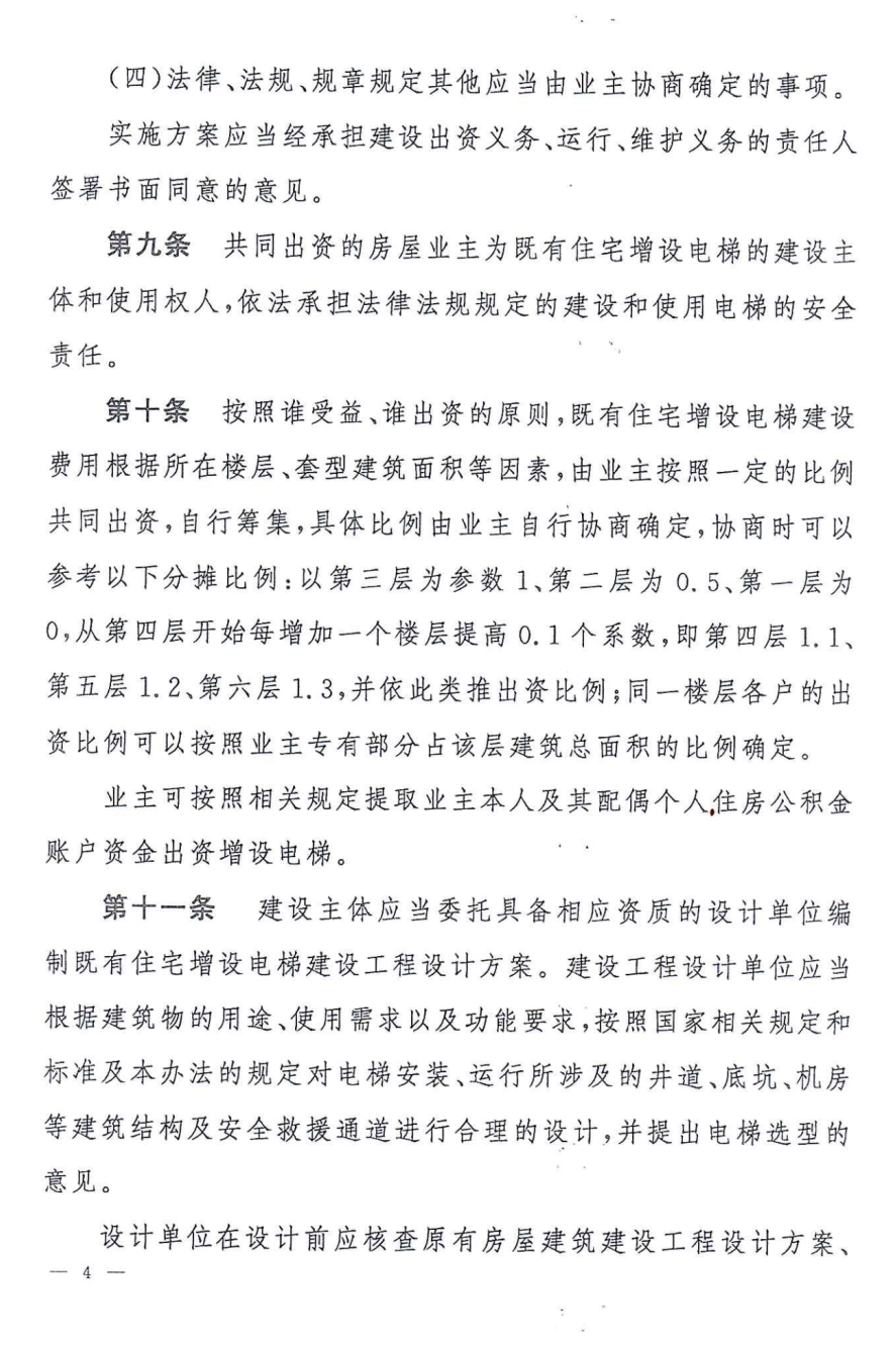 《辦法》明確,既有住宅增設(shè)電梯以房屋單元為單位發(fā)起,業(yè)主書面簽署同意意見、實施方案、安全責(zé)任、建設(shè)費用的分攤比例、可提取本人及其配偶公積金等。