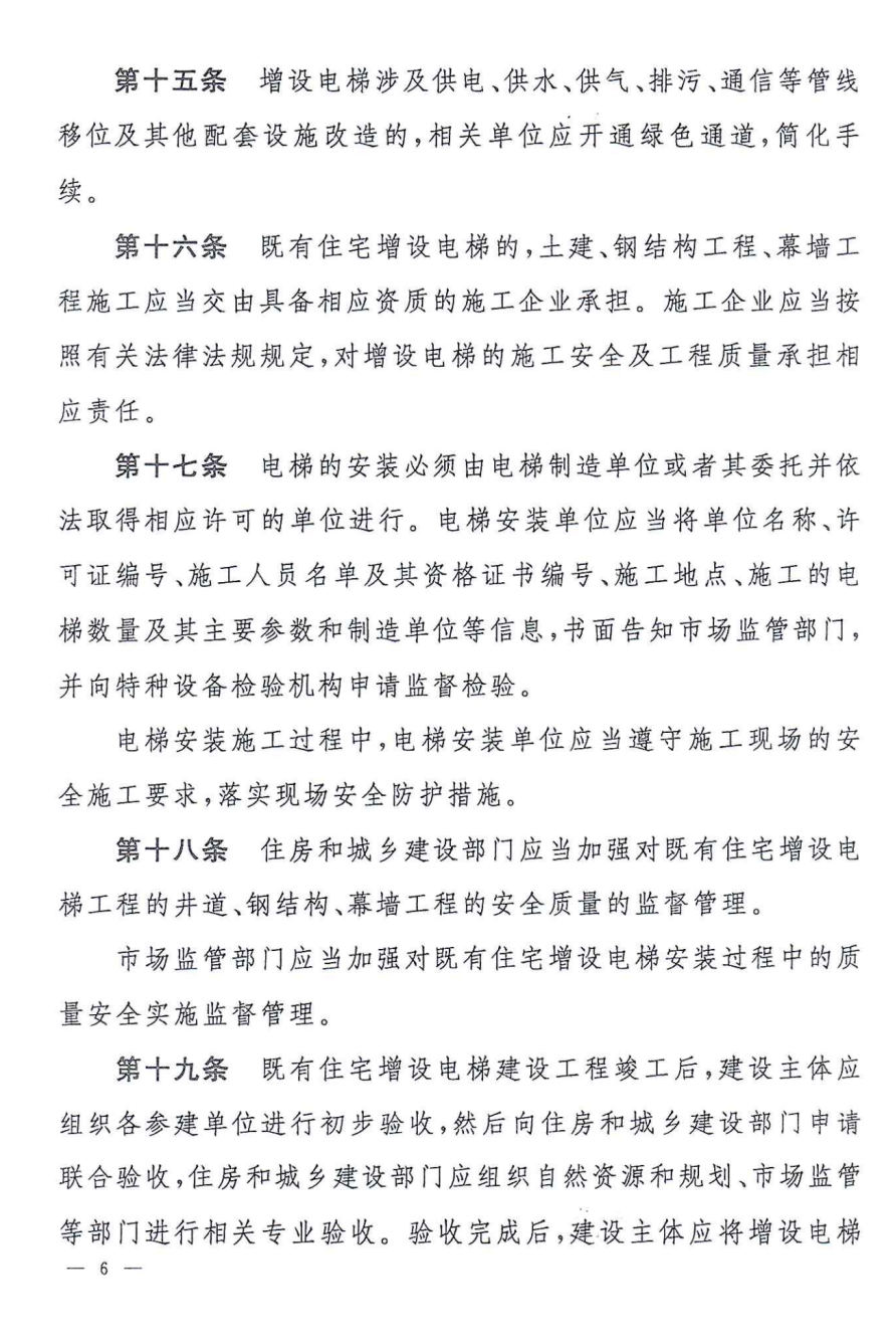 市、區(qū)住房和城鄉(xiāng)建設(shè)部門負責(zé)既有住宅增設(shè)電梯的施工安全監(jiān)督管理、消防審核備案工作。