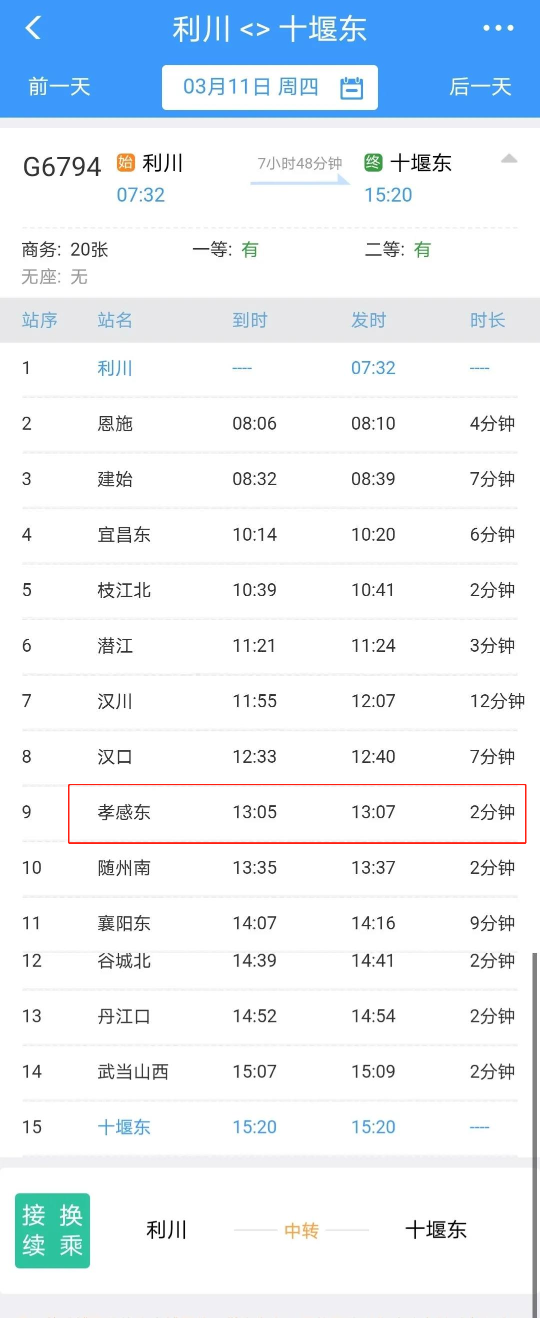 利川至十堰東G6794/5次,利川站7:32始發(fā),沿途停靠恩施、建始、宜昌東、枝江北、潛江、漢川、漢口、孝感東、隨州南、襄陽(yáng)東、谷城北、丹江口、武當(dāng)山西等站,15:20終到十堰東。