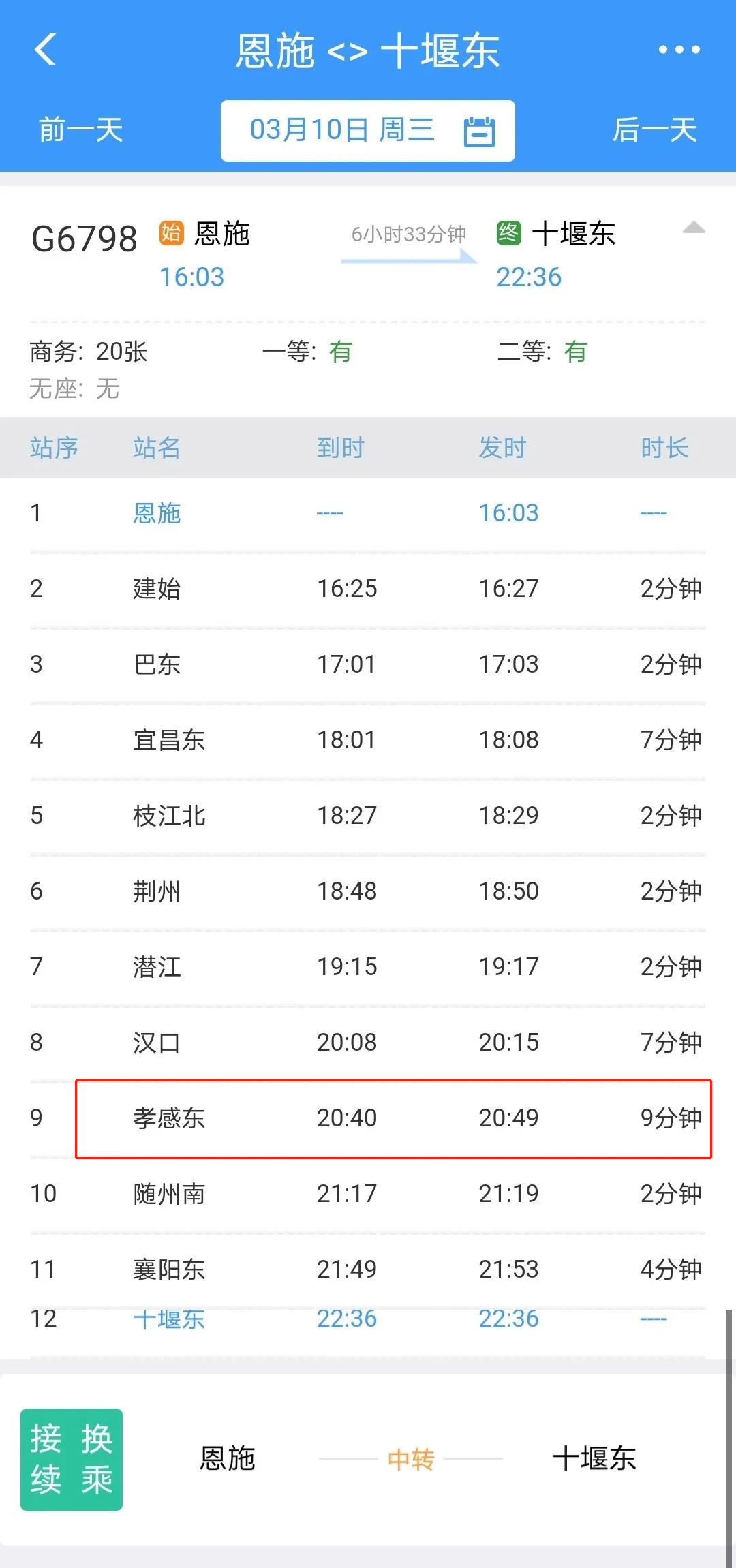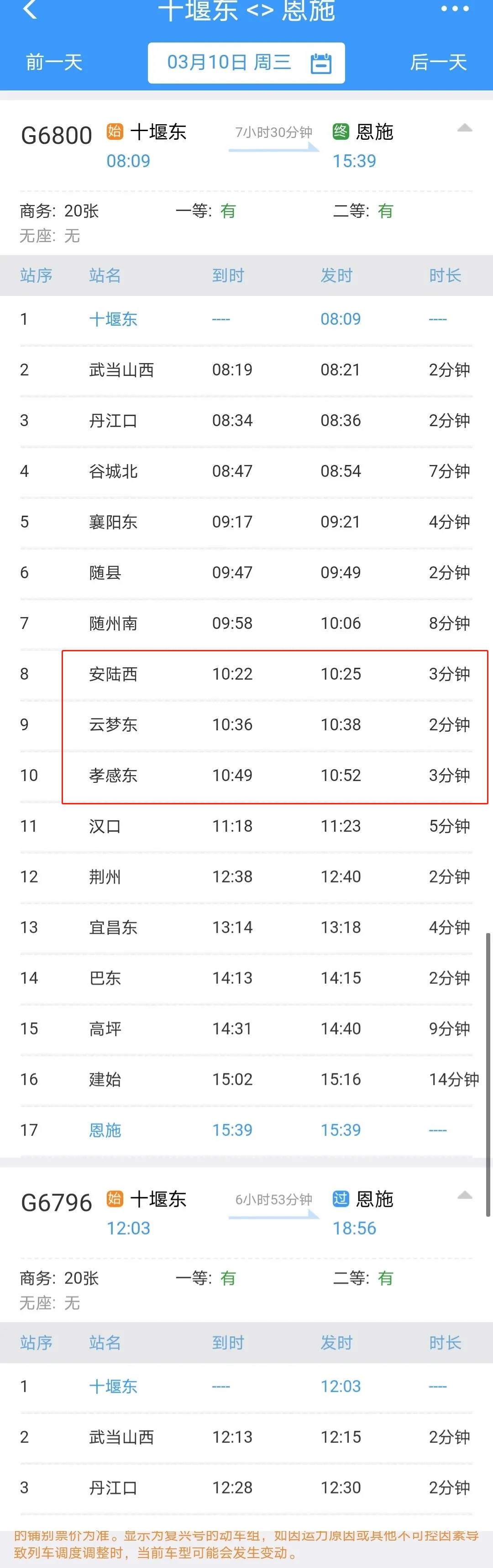 恩施至十堰東G6798/9次,恩施站16:03始發(fā),沿途??拷ㄊ肌蜄|、宜昌東、枝江北、荊州、潛江、漢口、孝感東、隨州南、襄陽(yáng)東等站,22:36終到十堰東。