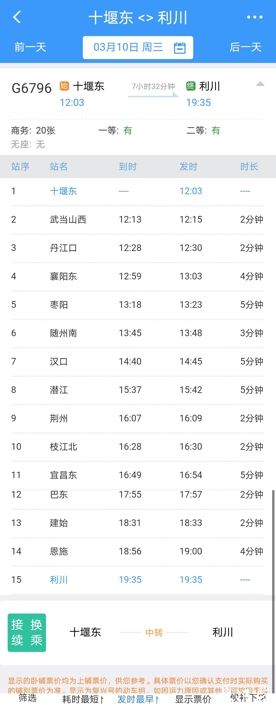 十堰東至利川G6796/3次,十堰東站12:03始發(fā),沿途停靠武當(dāng)山西、丹江口、襄陽(yáng)東、隨州南、漢口、潛江、荊州、枝江北、宜昌東、巴東、建始、恩施等站,19:35終到利川。