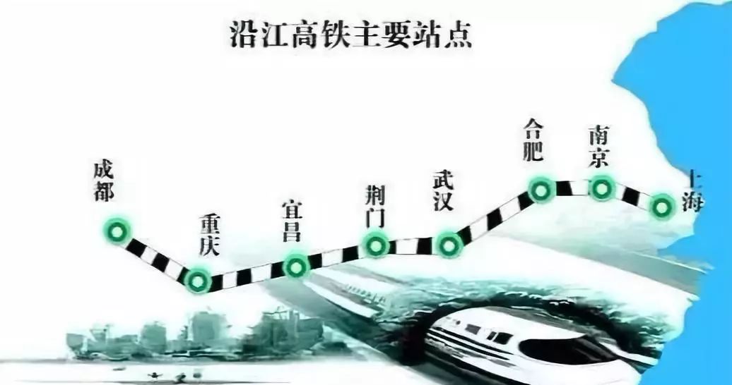 沿江高鐵,起自上海,經(jīng)過江蘇、安徽、湖北、重慶和四川,全長約1800多公里,新建線路約1500公里,設(shè)計時速350公里。
