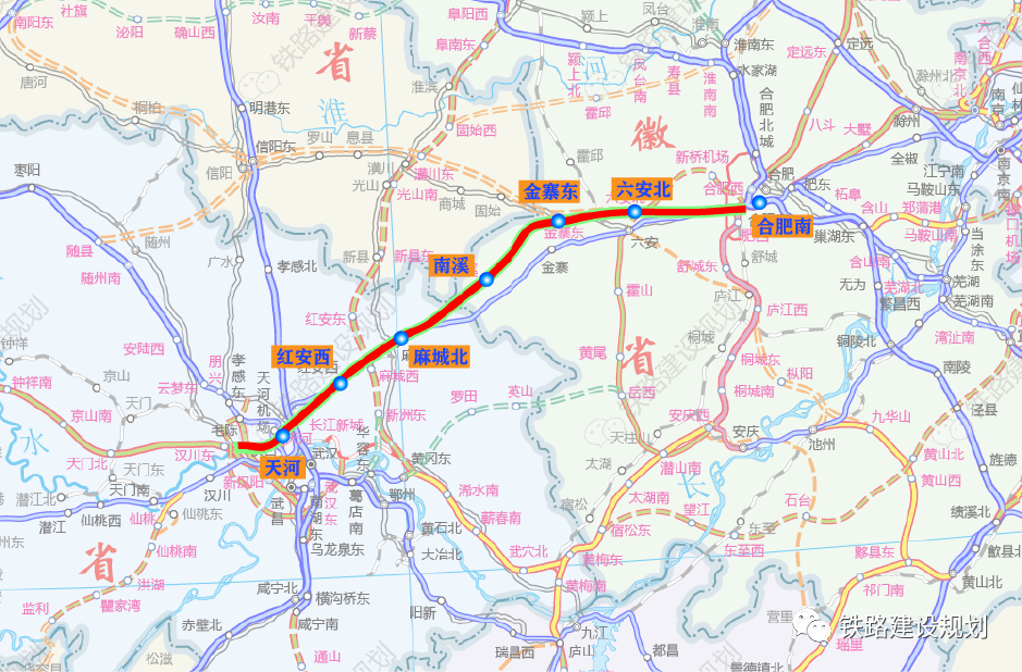 沿江高鐵合肥至武漢段線路東起合肥,經(jīng)六安、金寨、麻城至武漢,線路全長約342公里。