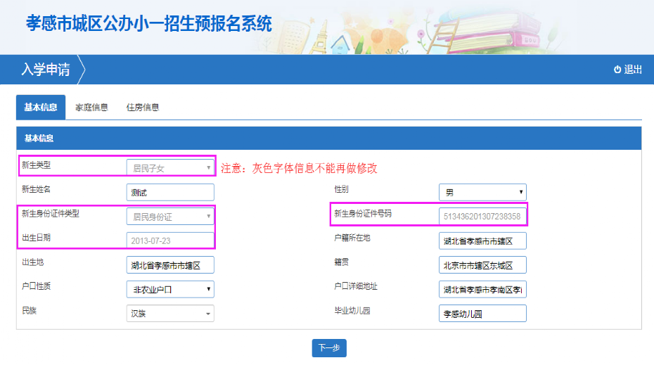 1、基本信息填寫:基本信息頁面“新生類型、新生身份證件類型、新生身份證號(hào)碼、出生日期”四項(xiàng)信息不可以修改。