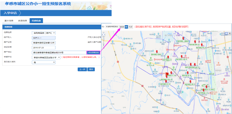 (2)住房地址,點(diǎn)擊房產(chǎn)地址處“點(diǎn)擊獲取定位”彈出地圖頁面,在地址搜索欄中輸入“樓盤或房屋詳細(xì)地址”進(jìn)行搜索,鼠標(biāo)左鍵點(diǎn)擊該位置,旗幟定位在此處后,點(diǎn)擊確定,回到住房信息頁面即可選擇住房范圍內(nèi)對(duì)應(yīng)的學(xué)校。