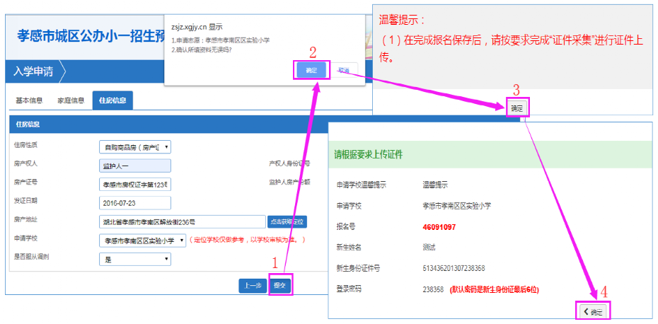 四、住房信息填寫完成后點(diǎn)擊“提交”,確認(rèn)所填資料無誤,點(diǎn)擊確定彈出報(bào)名號(hào)和登錄賬號(hào)(身份證號(hào))及密碼等,再點(diǎn)擊確認(rèn)按鈕,到證件采集頁面。