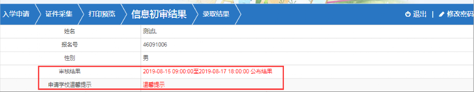 六、點(diǎn)擊“信息初審結(jié)果”可以查閱審核結(jié)果和申請(qǐng)學(xué)校溫馨提示。