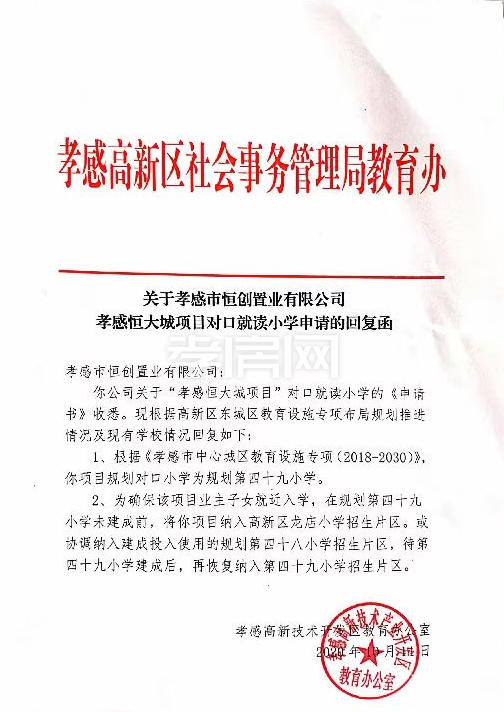 孝感恒大城學(xué)區(qū)回復(fù)函