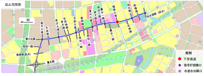 ? ? ? ?航天大道~仙女湖路段長5230.422米,道路標(biāo)準(zhǔn)斷面寬度為50米,雙向6車道。
