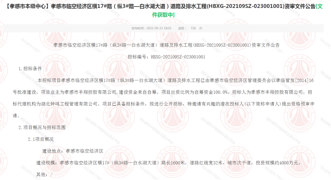 建設(shè)規(guī)模:孝感市臨空經(jīng)濟(jì)區(qū)橫17#(縱3#路—白水湖大道)路長(zhǎng)1600米,道路紅線寬32米,城市次干道,投資規(guī)模約4000萬(wàn)元。