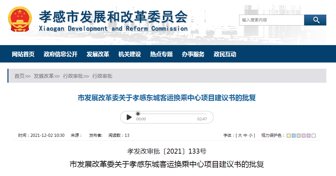 ? ? ? ?12月1日,孝感市發(fā)展和改革委員會(huì)官網(wǎng)發(fā)布了孝感東城客運(yùn)換乘中心項(xiàng)目建議書(shū)的批復(fù)。