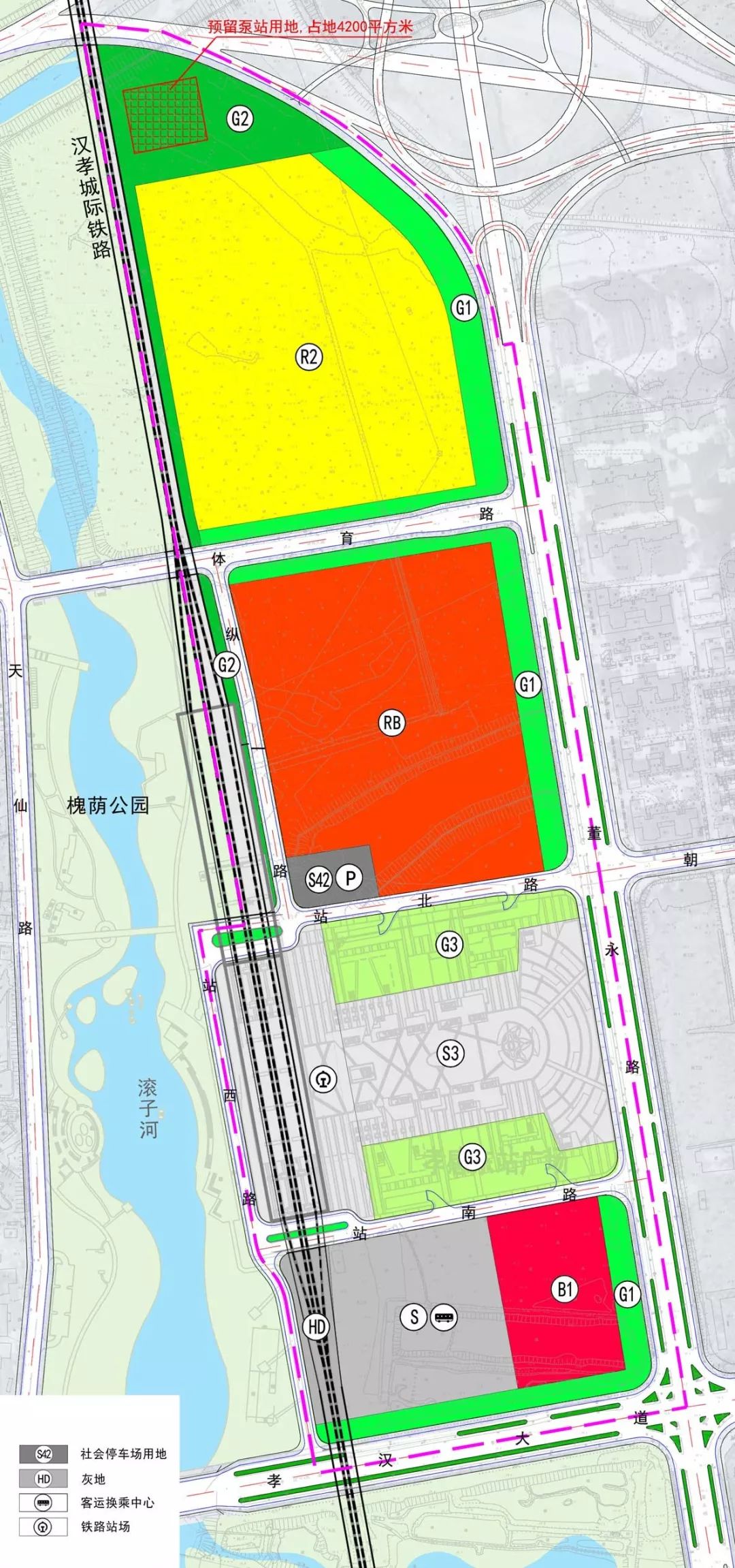 ? ? ? ?從規(guī)劃圖可以看出,孝感東站周邊規(guī)劃了鐵路站場(chǎng)、客運(yùn)換乘中心、公園、社會(huì)停車場(chǎng)等區(qū)域。