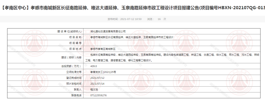 湖北省電子交易平臺(tái)中發(fā)布了孝感市南城新區(qū)長(zhǎng)征南路延伸、維達(dá)大道延伸、玉泉南路延伸市政工程設(shè)計(jì)項(xiàng)目報(bào)建公告,投資總共達(dá)到了409萬(wàn)元。