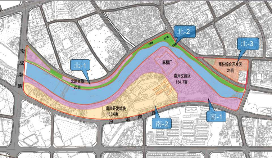 項(xiàng)目總用地571.7畝,其中:水域面積160.6畝;南岸316.6畝;北岸94.5畝。區(qū)域河道長(zhǎng)約1.5km,寬60m-90m,旅游開(kāi)發(fā)凈用地約365.6畝,其中:文旅用地約186畝,商住開(kāi)發(fā)用地約179.6畝。