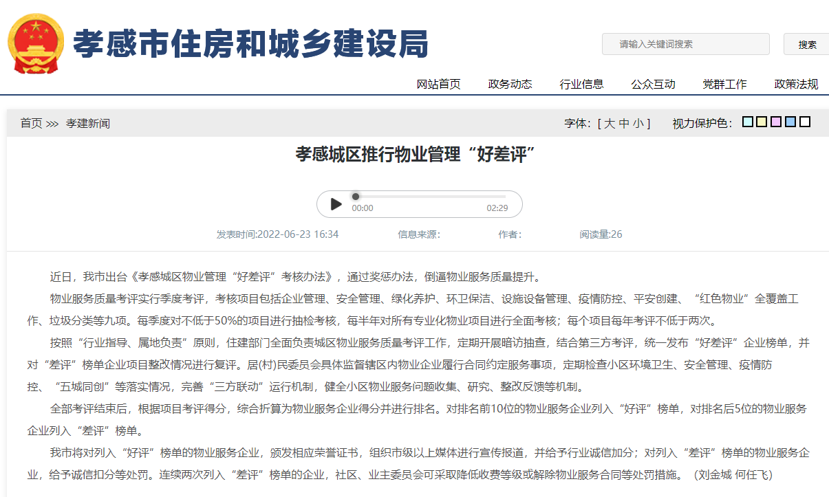 ? ? ? ?近日,我市出臺《孝感城區(qū)物業(yè)管理“好差評”考核辦法》,通過獎懲辦法,倒逼物業(yè)服務(wù)質(zhì)量提升。