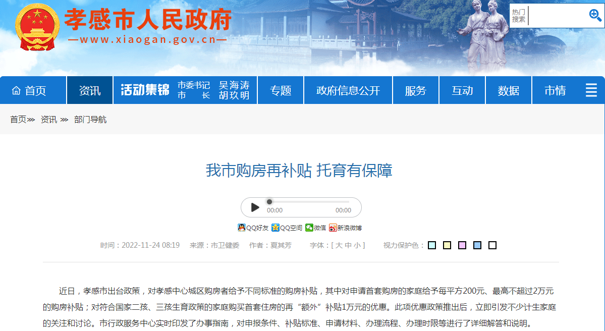 ? ? ? ?近日,孝感市出臺(tái)政策,對(duì)孝感中心城區(qū)購(gòu)房者給予不同標(biāo)準(zhǔn)的購(gòu)房補(bǔ)貼,其中對(duì)申請(qǐng)首套購(gòu)房的家庭給予每平方200元、最高不超過2萬元的購(gòu)房補(bǔ)貼;對(duì)符合國(guó)家二孩、三孩生育政策的家庭購(gòu)買首套住房的再“額外”補(bǔ)貼1萬元的優(yōu)惠。此項(xiàng)優(yōu)惠政策推出后,立即引發(fā)不少計(jì)生家庭的關(guān)注和討論。市行政服務(wù)中心實(shí)時(shí)印發(fā)了辦事指南,對(duì)申報(bào)條件、補(bǔ)貼標(biāo)準(zhǔn)、申請(qǐng)材料、辦理流程、辦理時(shí)限等進(jìn)行了詳細(xì)解答和說明。