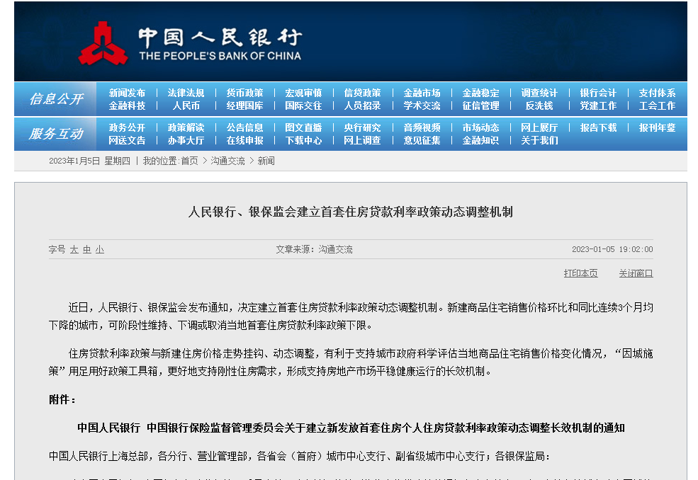 ? ? ? ?《中國人民銀行中國銀行保險監(jiān)督管理委員會關于階段性調整差別化住房信貸政策的通知》發(fā)布以來,對于支持各地城市政府因城施策用足用好政策工具箱,更好支持剛性住房需求,促進房地產(chǎn)市場平穩(wěn)健康發(fā)展發(fā)揮了積極作用。按照國務院部署,人民銀行、銀保監(jiān)會決定在階段性調整差別化住房信貸政策的基礎上,建立新發(fā)放首套住房商業(yè)性個人住房貸款利率政策動態(tài)調整長效機制。現(xiàn)就有關事項通知如下: