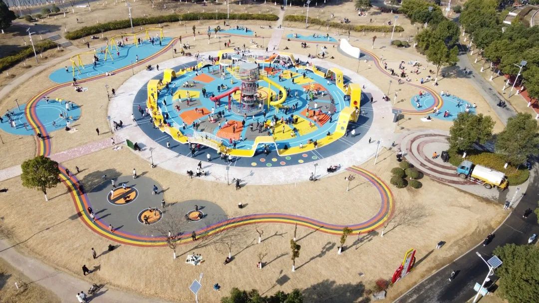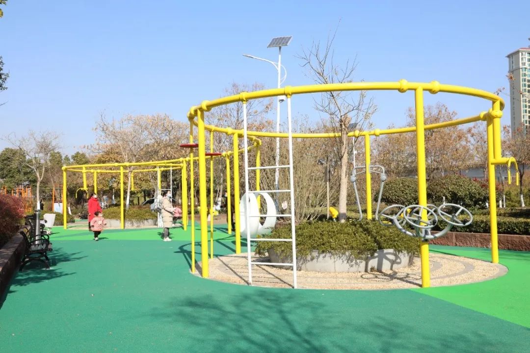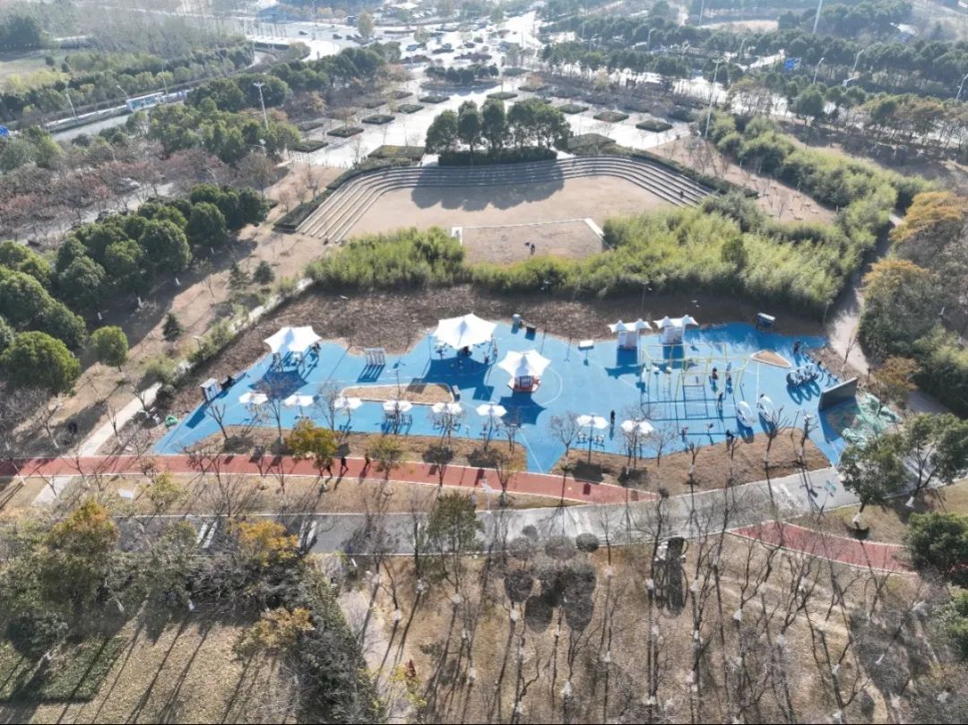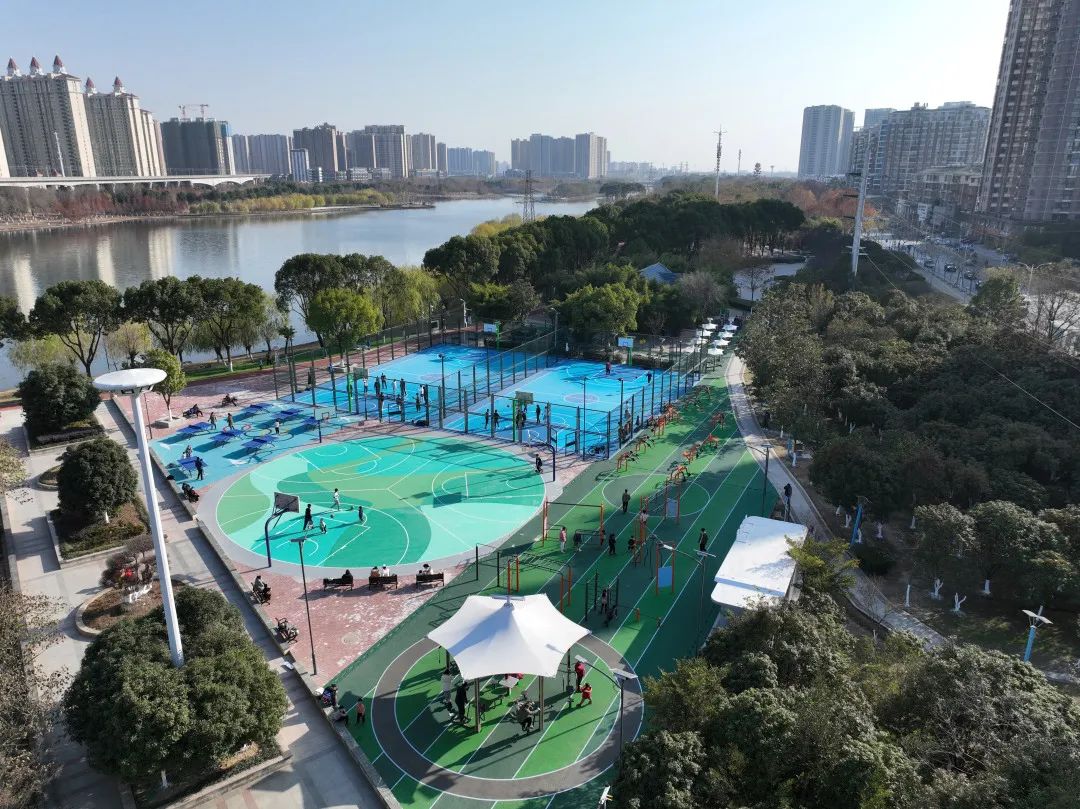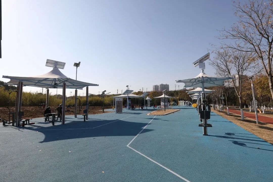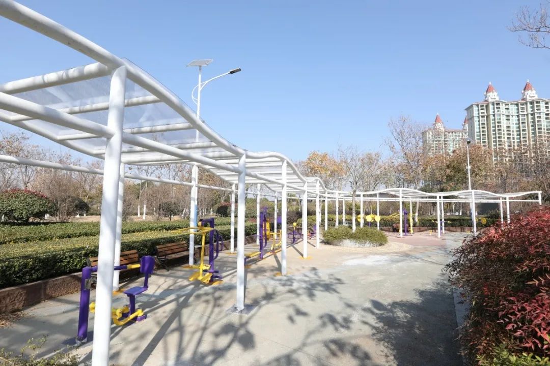 ? ? ? ?以滾子河為界,槐蔭體育公園東岸設(shè)置有全齡健身點、水上運動平臺和綜合健身點,景觀廊架處還為老年人及殘障人士設(shè)置了專屬運動路徑。